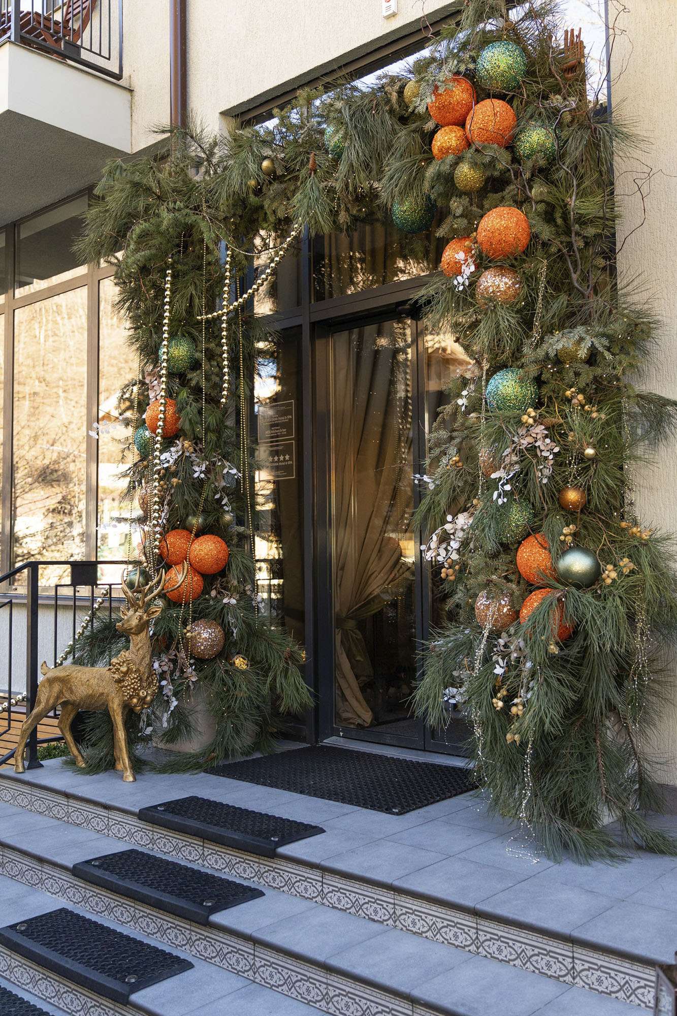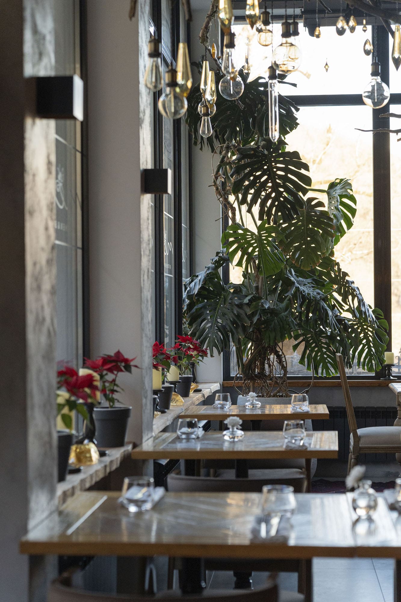 Особое внимание мы уделили дизайну. В оформлении преобладают натуральные материалы и природные оттенки. Эффектные фитостены из натурального мха, колонны из дерева, яблоневые ветви под потолком и дизайнерские предметы интерьера подчеркивают эко-направленность заведения.